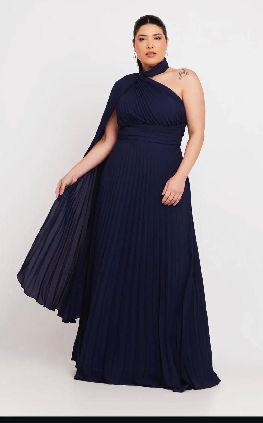 Seu decote com gargantilha embutida e a capa fluida sobre um dos ombros trazem um toque de modernidade e imponência, tornando-o ideal para madrinhas, formandas e eventos de gala.