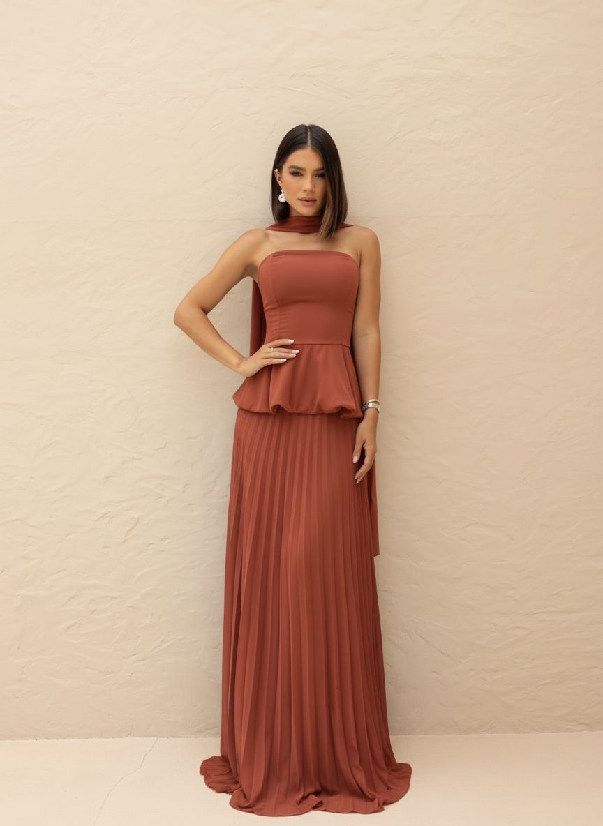 A saia longa plissada em musseline confere movimento suave a cada passo, garantindo leveza e imponência na medida certa. O fechamento em zíper invisível nas costas proporciona um ajuste perfeito ao corpo.