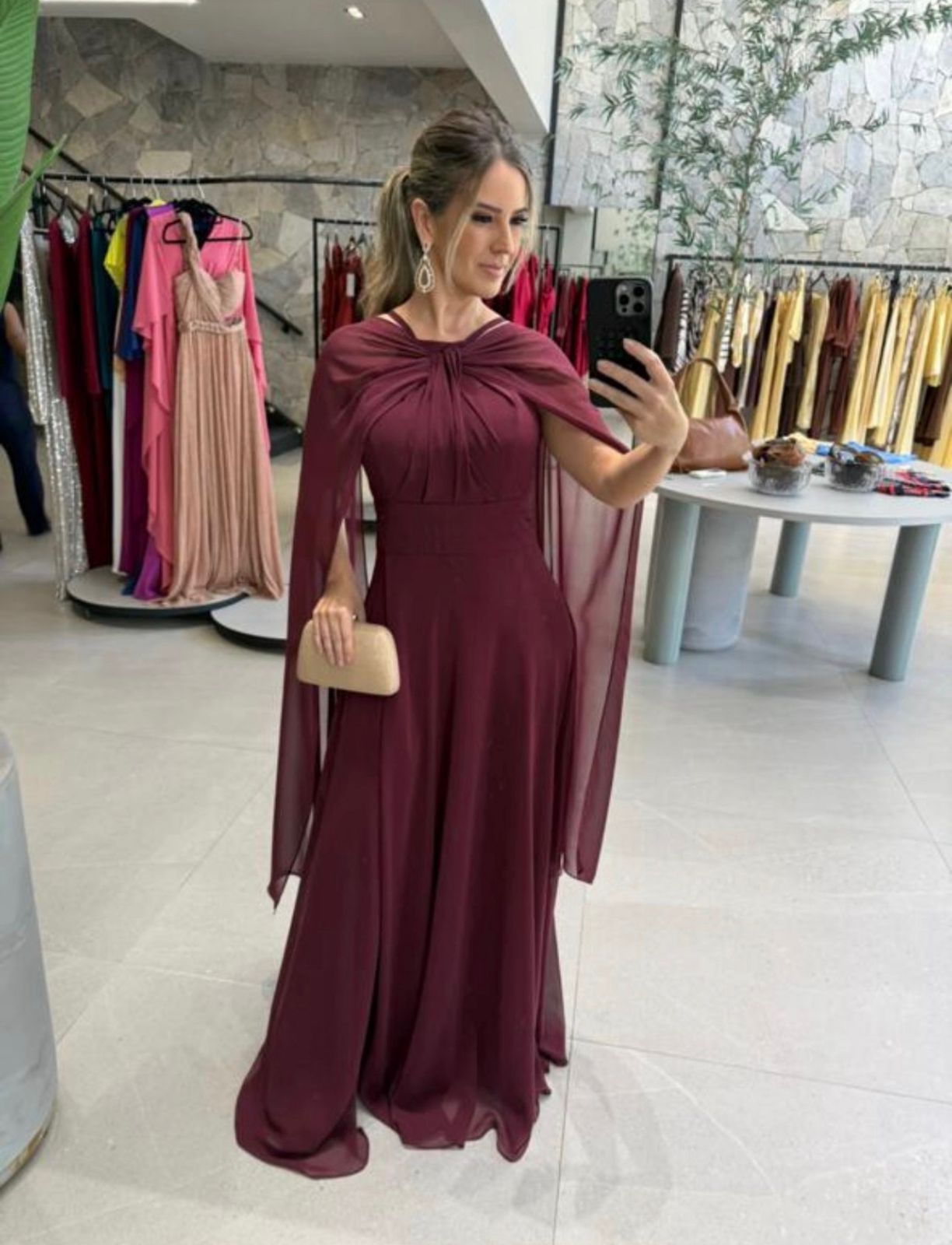 O destaque do modelo é a capa em musseline, que pode ser usada de diversas formas — nos ombros, solta ou cruzada — permitindo diferentes composições e estilos em um único vestido.