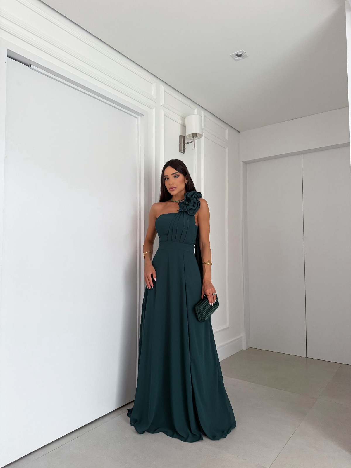 O vestido Alessandra é a definição de elegância romântica. Seu modelo um ombro só com detalhe de flor aplicada no ombro combina delicadeza e sofisticação em cada traço. A saia longa com fenda sutil garante leveza e movimento, ideal para eventos onde o charme é protagonista.