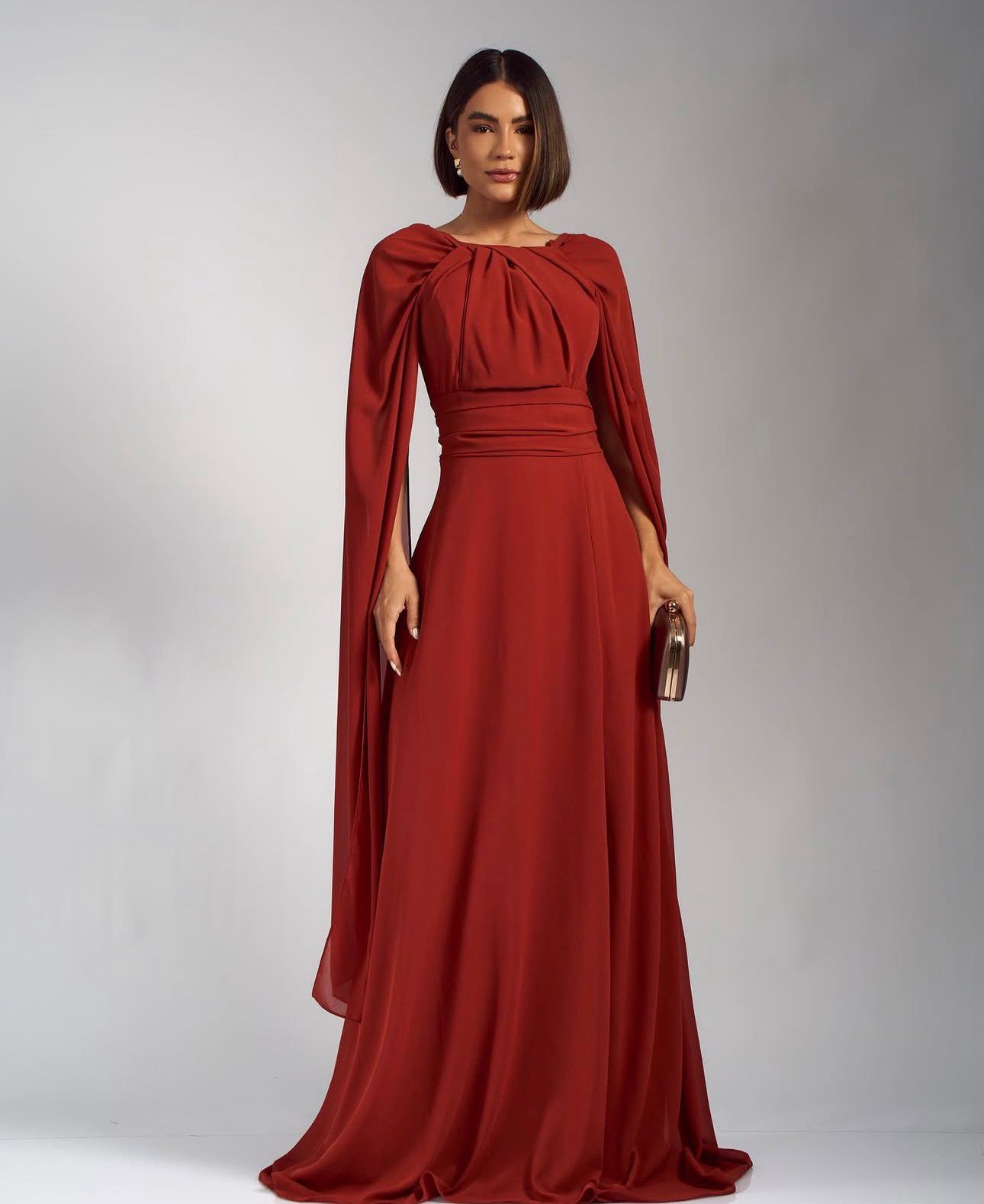 O destaque do modelo é a capa em musseline, que pode ser usada de diversas formas — nos ombros, solta ou cruzada — permitindo diferentes composições e estilos em um único vestido.