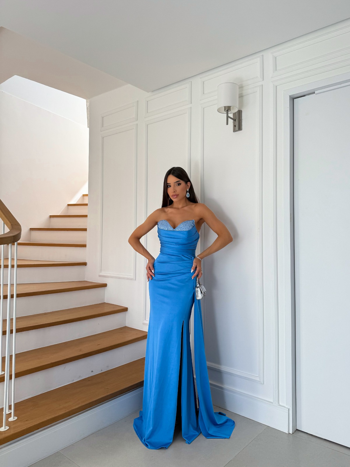O destaque fica por conta do busto em paetê, que adiciona um toque glamouroso e iluminado ao visual, perfeito para eventos noturnos e ocasiões que pedem presença marcante. O modelo tomara que caia com drapeado frontal valoriza as curvas e traz equilíbrio entre sensualidade e refinamento.