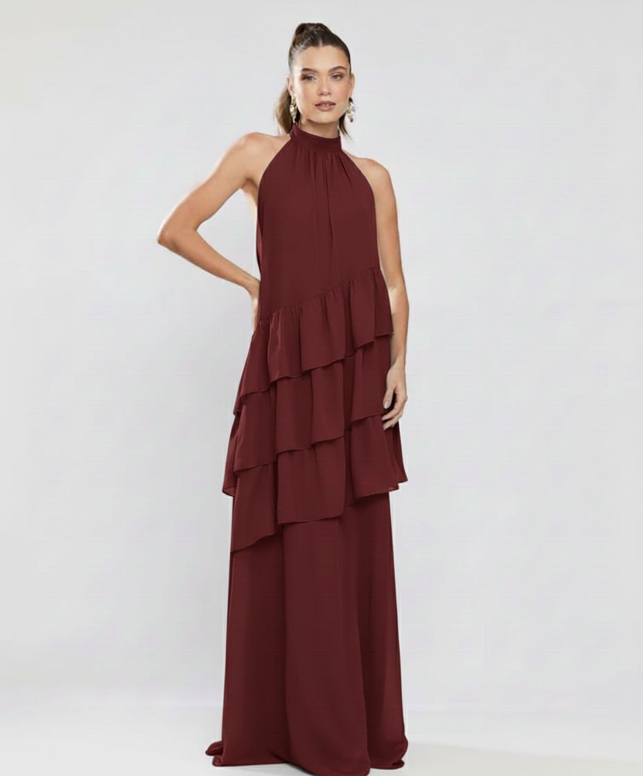 O decote halter com gola alta valoriza o colo e alonga a postura, garantindo um toque de sofisticação. A modelagem solta e fluida oferece extremo conforto, enquanto o caimento impecável da musseline proporciona movimento leve e gracioso a cada passo.