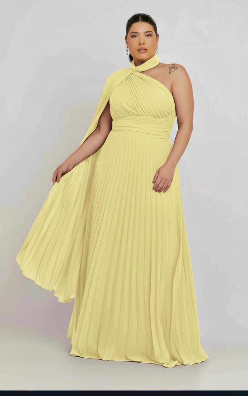Seu decote com gargantilha embutida e a capa fluida sobre um dos ombros trazem um toque de modernidade e imponência, tornando-o ideal para madrinhas, formandas e eventos de gala.