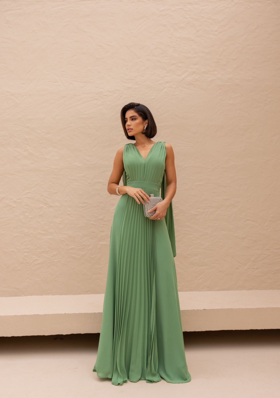 Com decote em V e delicadas pregas por toda a extensão do tecido, o Rachel valoriza a silhueta de forma natural e confere movimento a cada passo. O detalhe das alças com amarração nos ombros adiciona um toque romântico e moderno à produção.