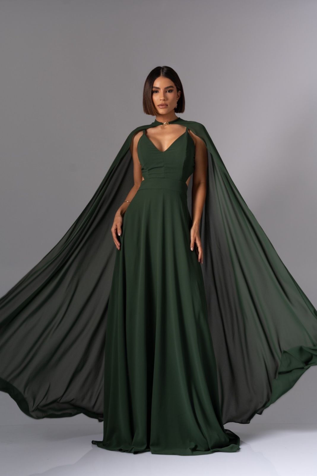 O design conta com decote em V profundo e uma capa longa integrada, que adiciona dramaticidade e modernidade ao visual. A cintura marcada realça a silhueta, enquanto a saia fluida garante um caimento impecável em todos os ângulos.