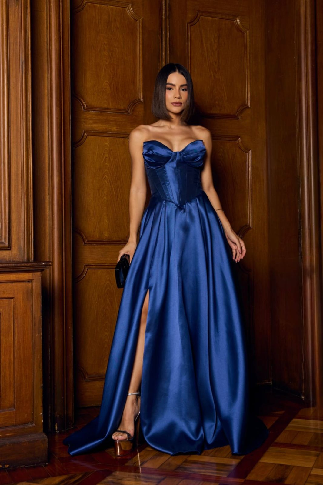 Combine com sandálias de salto fino e acessórios delicados para equilibrar a imponência do vestido. Uma clutch elegante finaliza o look com sofisticação.