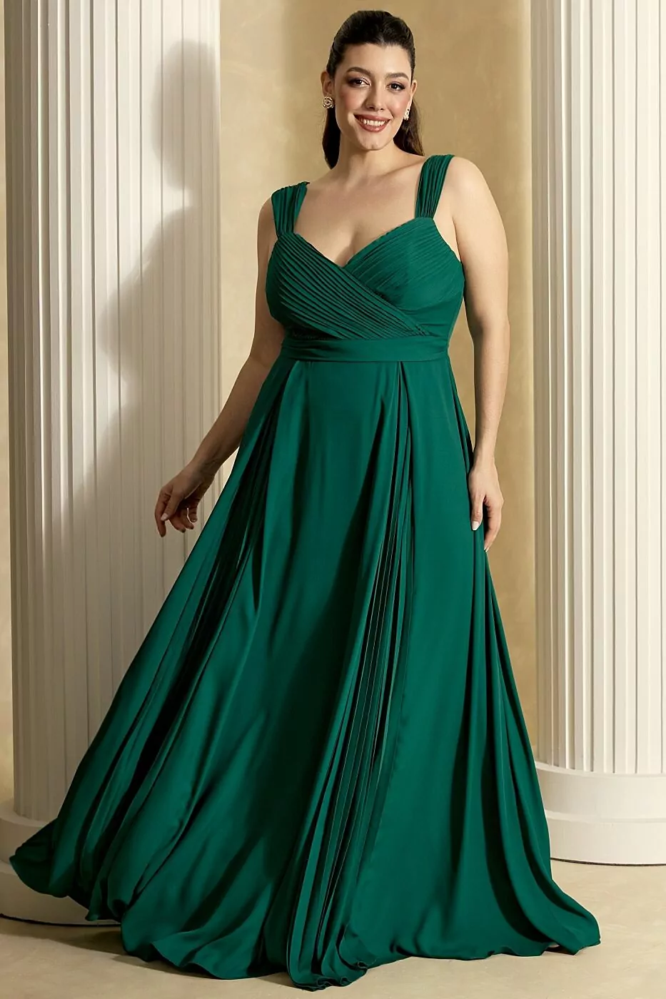 As alças largas proporcionam segurança e harmonia às proporções, enquanto a saia ampla e fluida transmite movimento e imponência, perfeita para quem busca um look marcante e gracioso.
