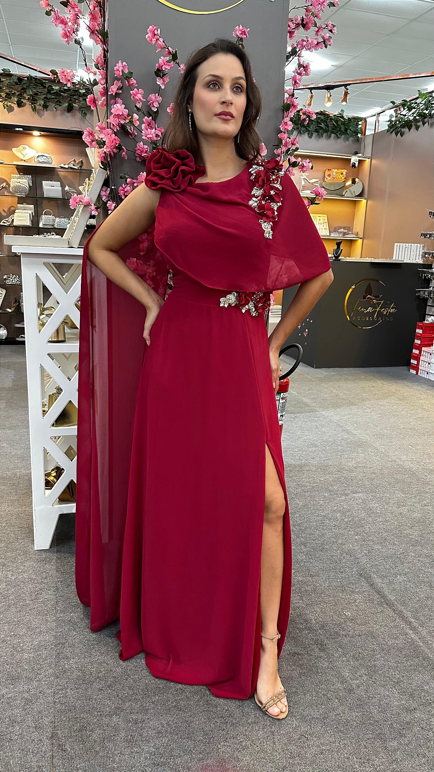 A leveza da musseline aliada ao trabalho manual em pedraria e à capa fluida transforma o Mafalda em uma peça única, perfeita para quem busca elegância, movimento e sofisticação em um só look.